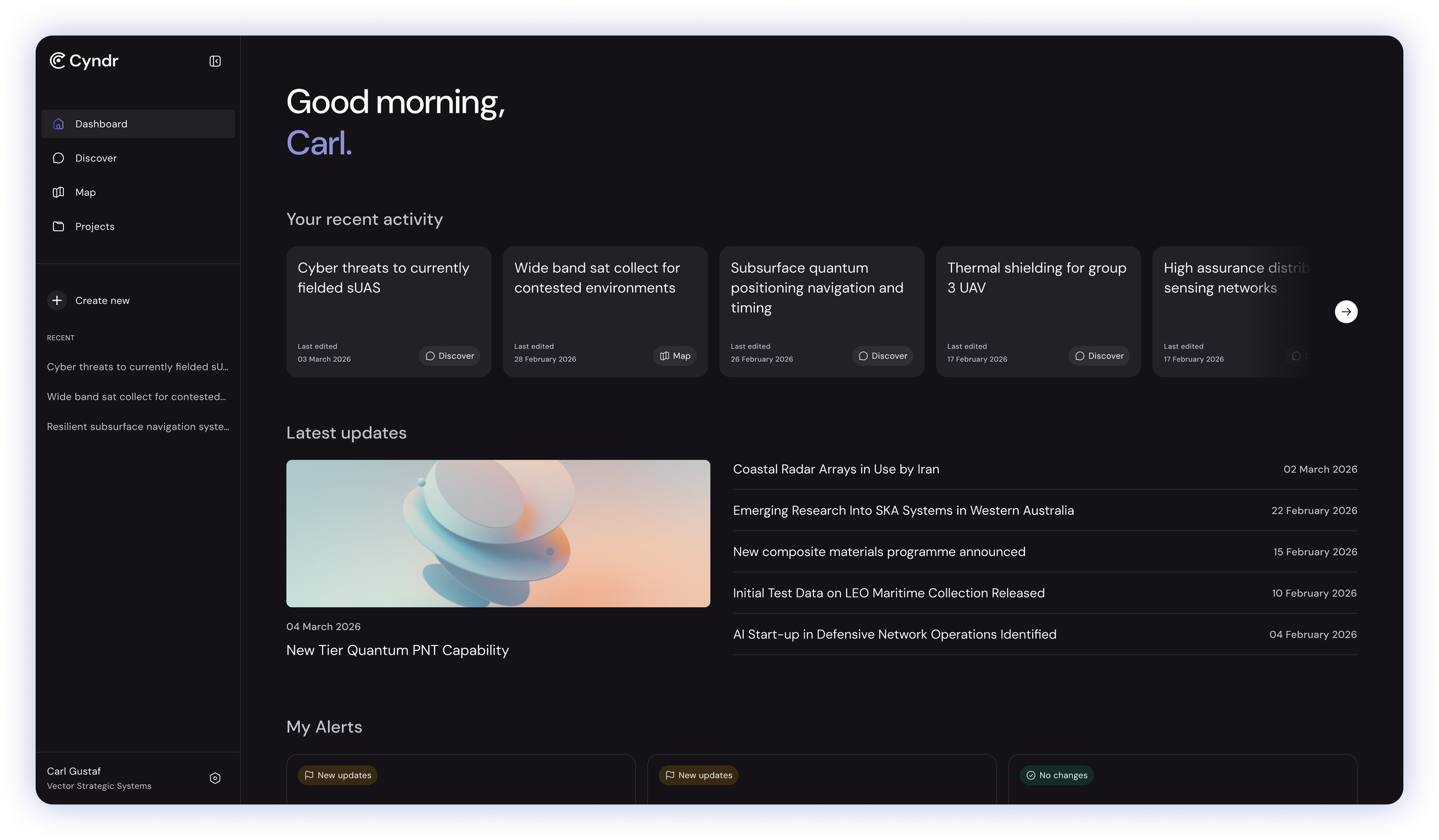 Cyndr enables organisations to track developments across research programs, emerging technologies, and industry activity, helping teams maintain situational awareness of innovation landscapes.