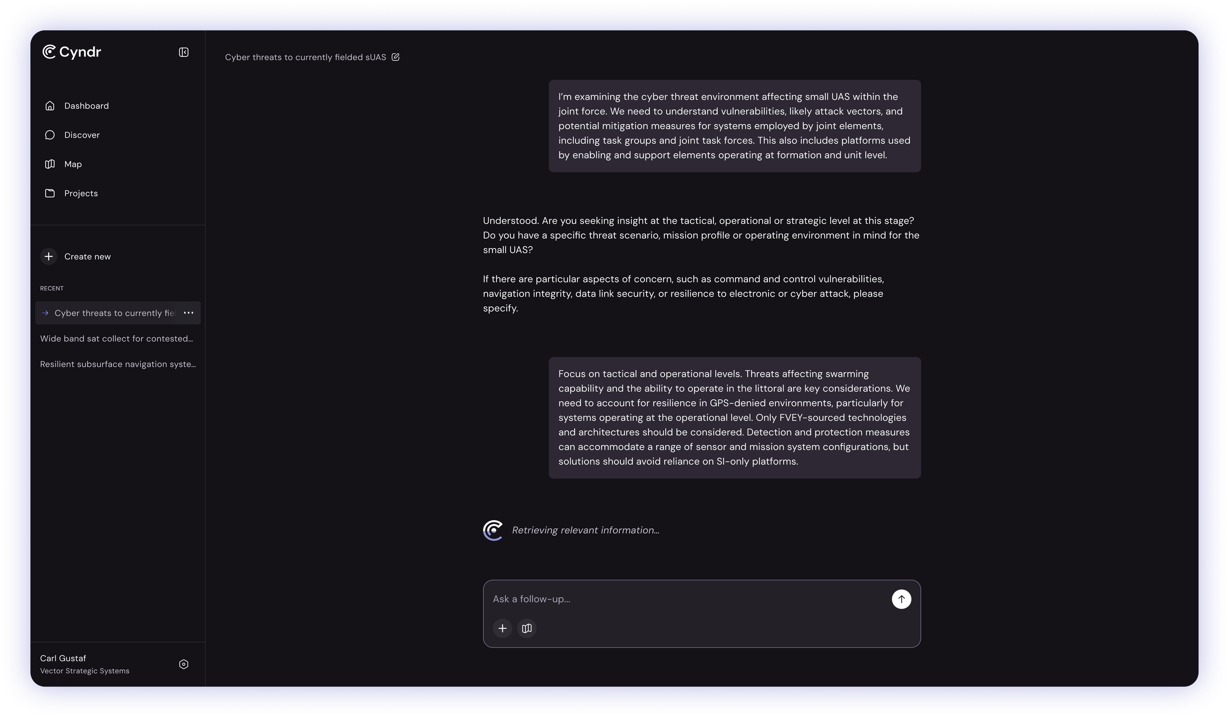 Cyndr aggregates signals from research institutions, technology companies, government programs, and industry activity to provide a structured view of emerging capability landscapes. This enables users to identify relevant technologies earlier, understand who is developing them, and explore how they relate to operational capability domains.